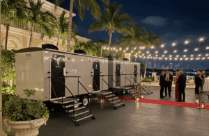Define your luxury event with VIP restroom trailers. Features: A/C, touchless technology, elegant design, and on-site attendants for impeccable service.